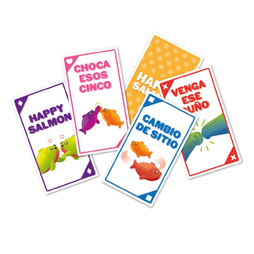 En Happy Salmon gana el primer jugador que se descarta de todas sus cartas y, para ello, solo tendréis que colocaros alrededor de una mesa. Cabe destacar que os recomendamos que lo hagáis de pie en lugar de sentados y que empleéis una mesa pequeña, lo suficiente como para que podáis chocaros los cinco unos a otros.