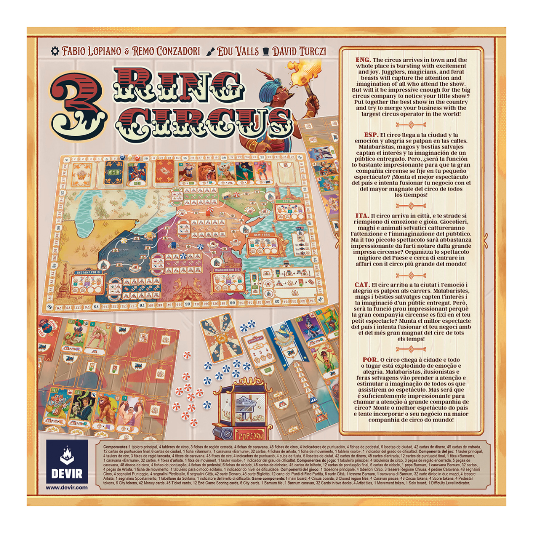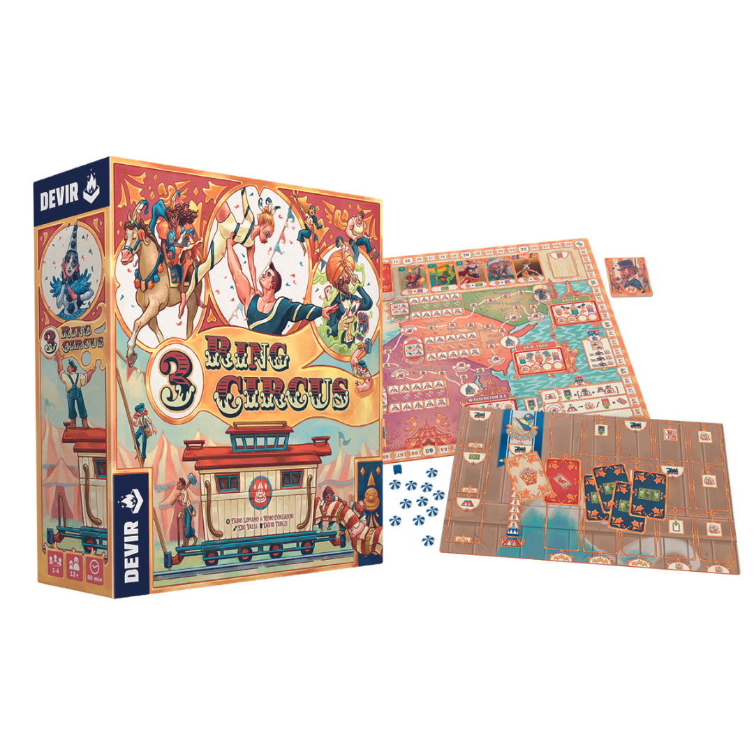 Diseñado por Fabio Lopiano (Merv, Autobahn, Calimala) y Remo Conzadori e ilustrado por Edu Valls (responsable del arte de juegos como Bitoku o Tiny Turbo Cars), 3 Ring Circus es un tÃtulo que se puede disfrutar en solitario o en un grupo de hasta 4 jugadores en el que los participantes se pondrán en la piel de un director de circo que recorre los Estados Unidos a finales del siglo XIX.