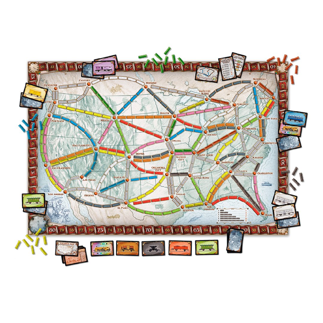 ¡Aventureros al Tren! es un juego de aventuras en tren. Los jugadores acumulan cartas de ciertos tipos de vagones que les permiten conectar diferentes ciudades a lo largo y ancho de Norteamérica. Mientras más largos son los recorridos, más puntos se ganan. Quienes consigan cumplir con sus Billetes de Destino conectando dos ciudades lejanas, y quien consiga construir la ruta ferroviaria continua más larga, ganarán puntos adicionales. Ve subiendo a bordo para pasar un buen rato, porque el viaje comienza ya… ¡Aventureros al Tren!