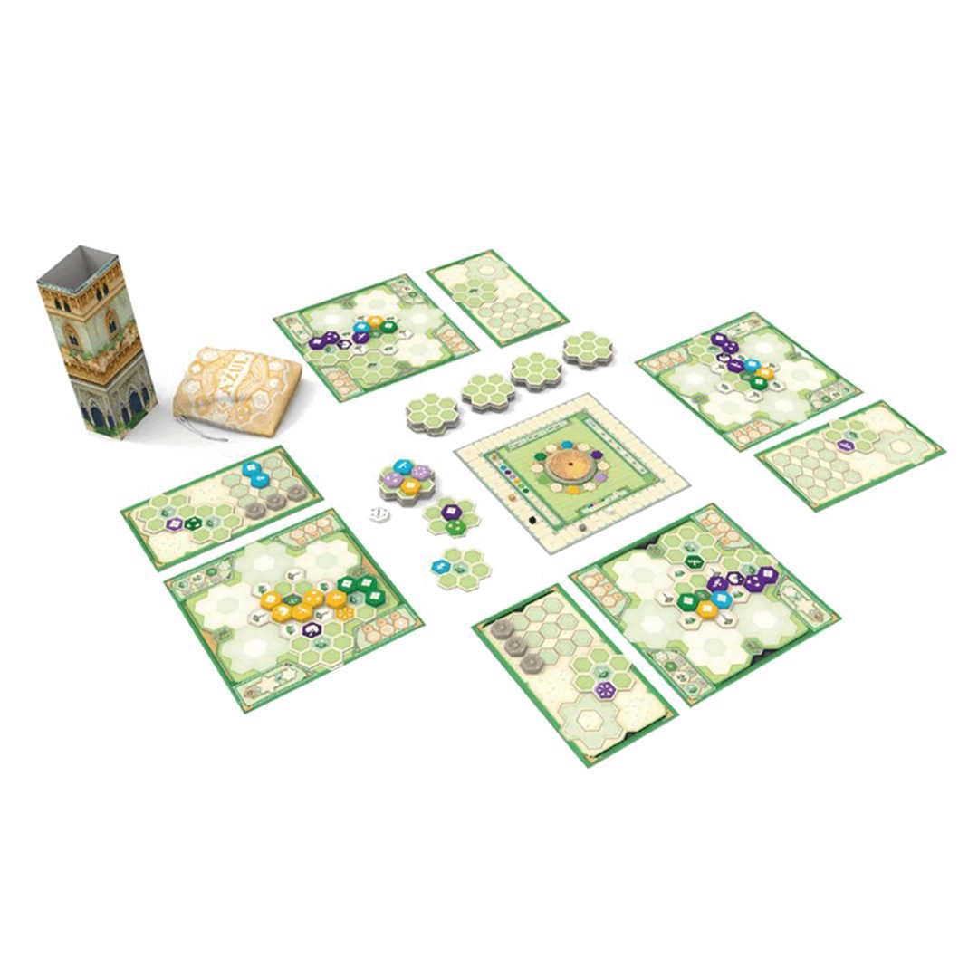 Lo primero que llama la atención de Azul: Jardín de la Reina es la inclusión de una pequeña torre de cartón que refleja a la perfección el tema del juego, que nos convertirá en diseñadores de jardines al servicio del Rey Manuel I de Portugal. Además, el tablero principal contiene un dial que los jugadores irán haciendo girar para reflejar las bonificaciones de las puntuaciones actuales.