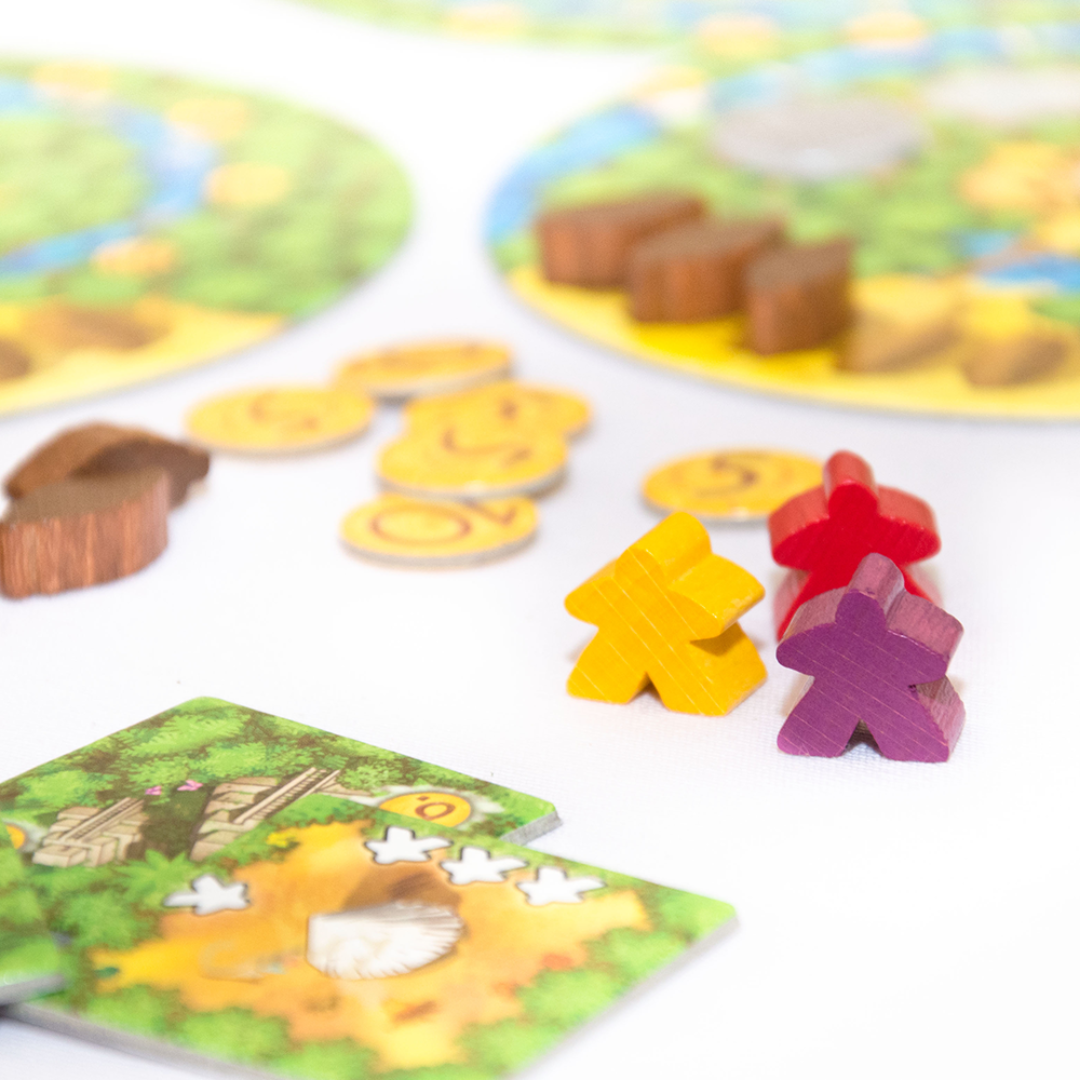 Los jugadores seleccionan una Loseta de Recolectores de su mano y la colocan adyacente a una de las Losetas de Selva en el tablero de juego (completándose luego los huecos entre ellas, como hemos explicado). Las acciones de las Losetas de Selva se ejecutan tantas veces como meeples tenga dibujado el lado adyacente: consigue cacao, cámbialo por oro, sube a tu aguador rÃo arriba, logra piedras solares o consigue tener la mayor cantidad de meeples en los templos.