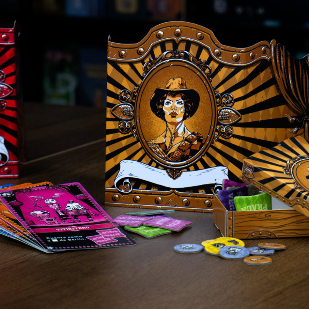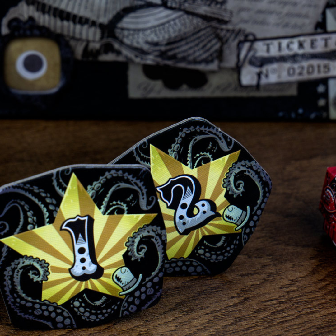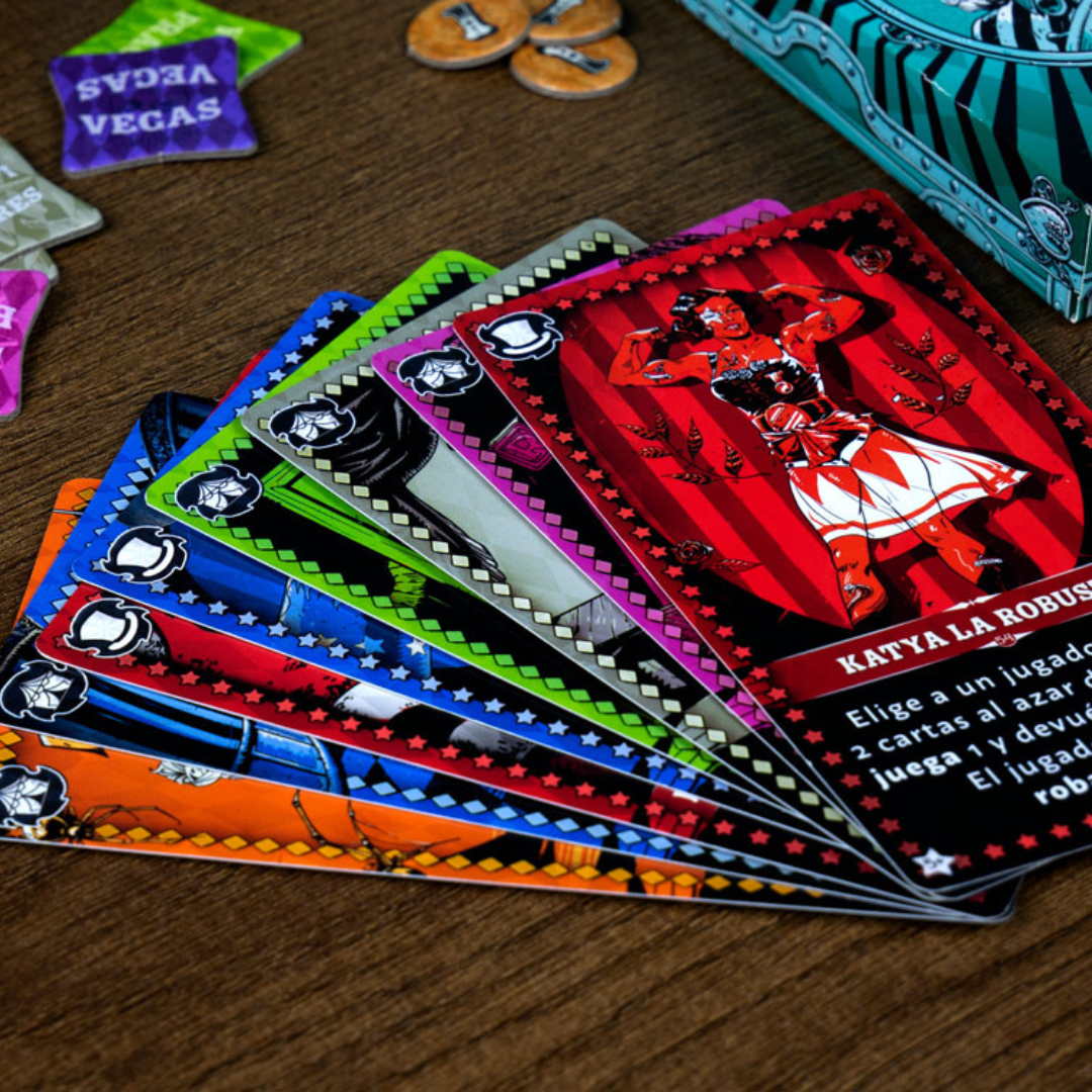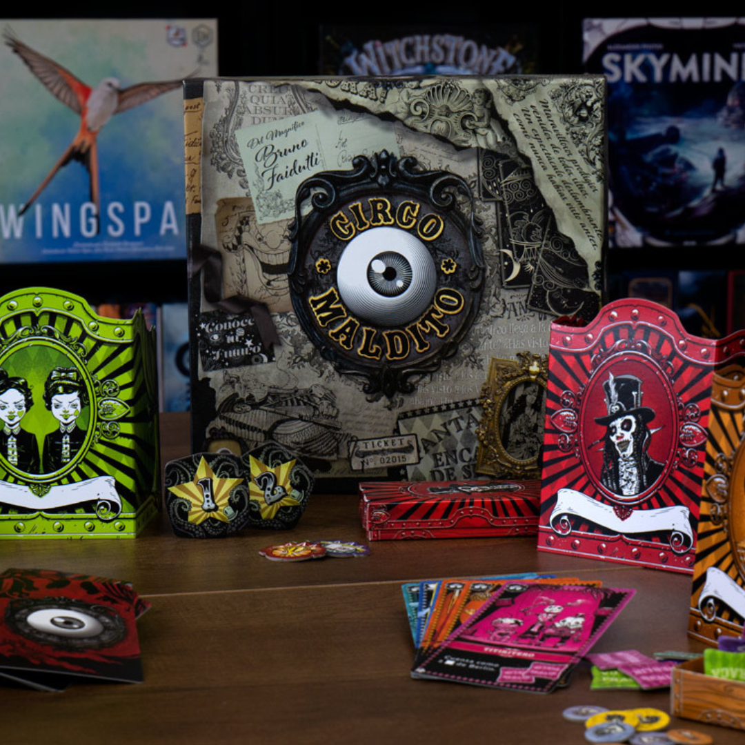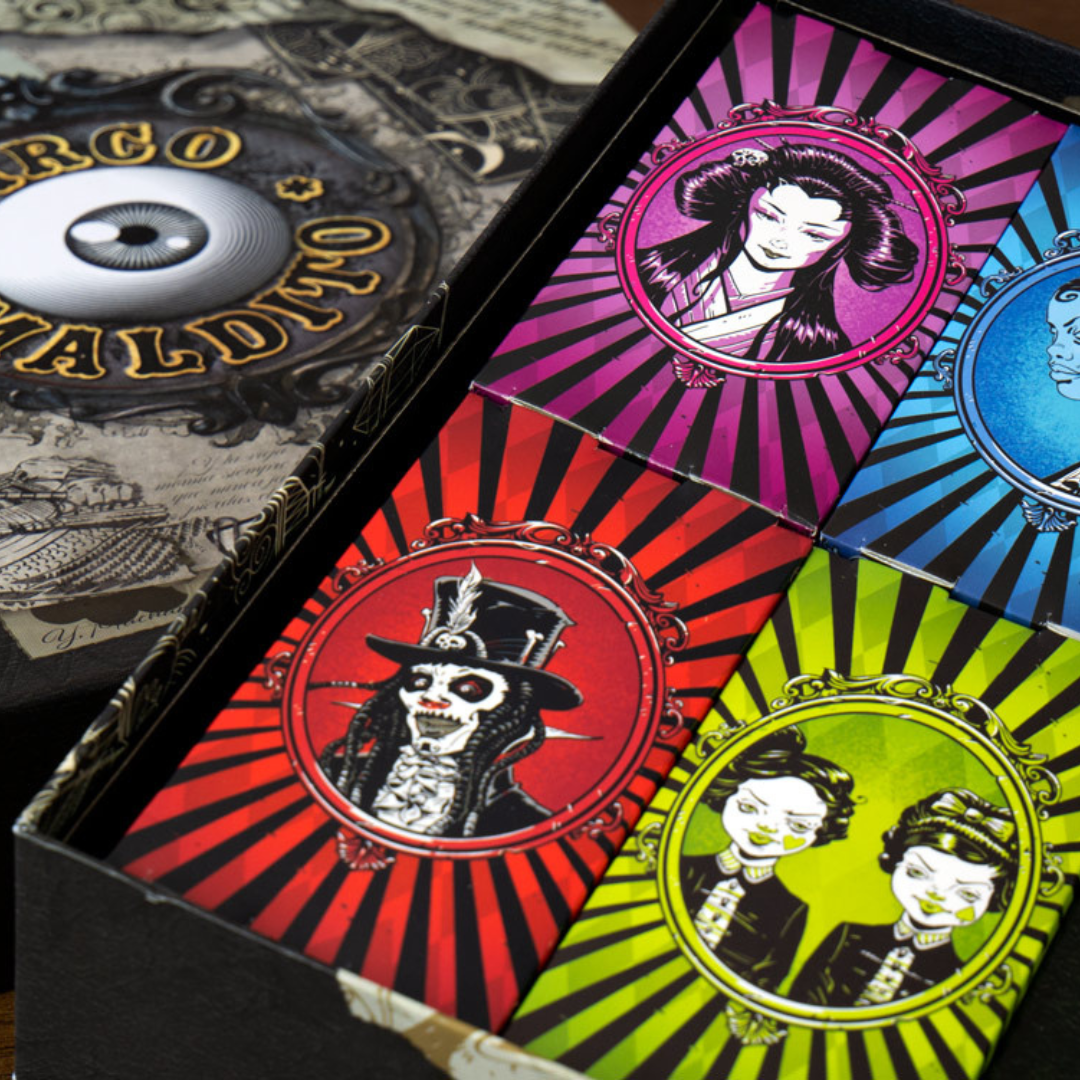 CIRCO MALDITO es un juego de cartas de atracciones espeluznantes para 4-8 jugadores en el que pujas por magnÃficas atracciones y negocias con espectáculos vecinos para conseguir formas únicas de sumar puntos. Aterroriza y emociona a los cansados trotamundos: ¡Ngozi la Temeraria y Odval el Infalible te esperan dentro!