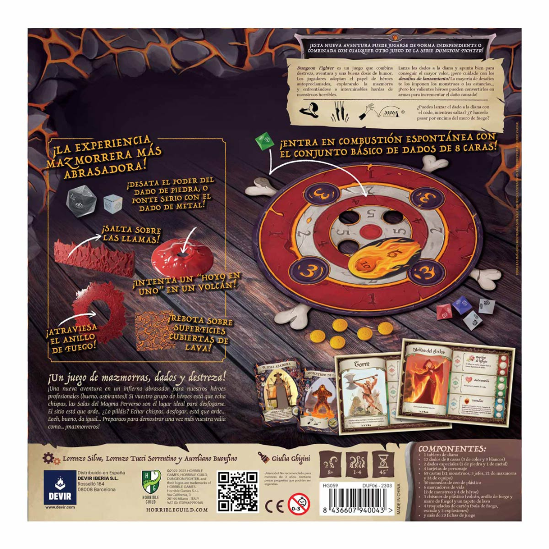 Vuelve Dungeon Fighter… ¡Más ardiente que nunca! Dungeon Fighter en las Salas del Magma Perverso es una expansión independiente para Dungeon Fighter, ¡Con nuevos contenidos de temática flamígera y un montón de chismes para jugar! ¡Tomen su dados y prepárense para demostrar su valía en la mazmorra!