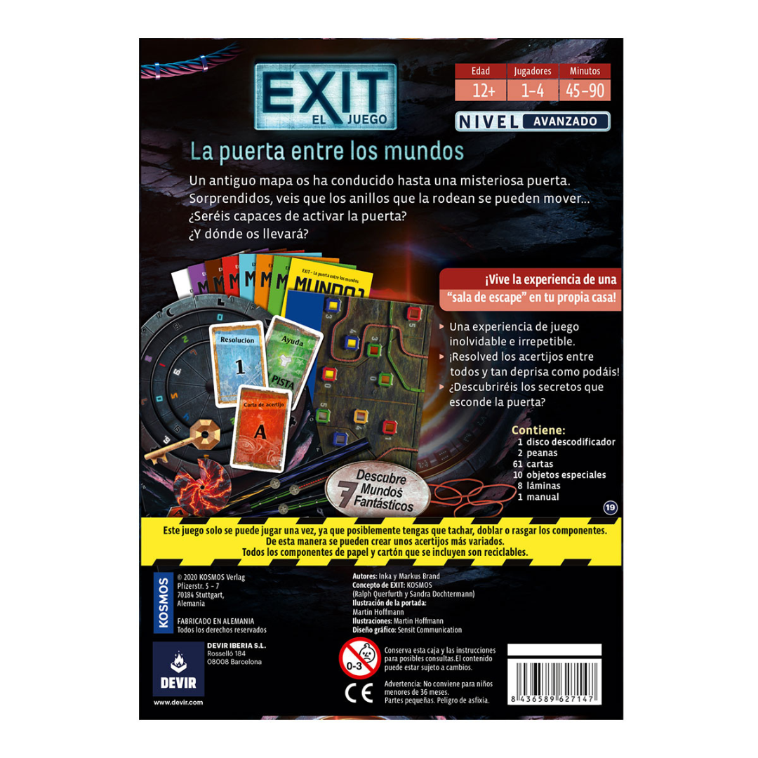 Con una dificultad de nivel avanzado, Exit: La puerta entre dos mundos es un tÃtulo ideal para aquellos que ya hayan probado algún juego de la saga y quieran subir un peldaño la dificultad superando un buen reto. Prestar atención a los detalles, la buena comunicación entre los miembros del equipo y afilar la capacidad de deducción serán las claves que les permitirán tener éxito en esta aventura. ¿Encontrarán el camino para volver a casa?