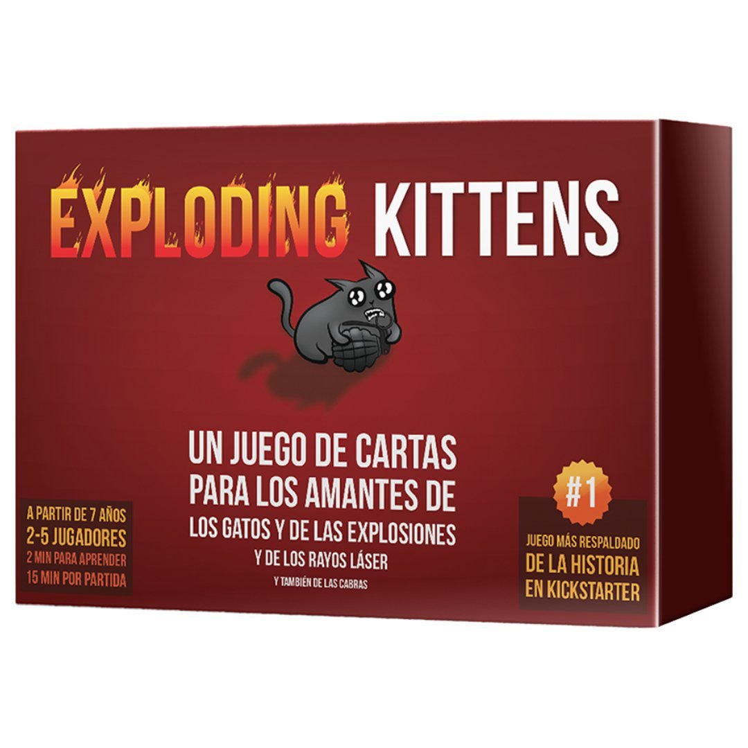 Se trata de una versión gatuna de la ruleta rusa con un gran componente estratégico. Los jugadores van robando cartas hasta que a alguien le sale un Exploding Kitten. Cuando esto sucede, esa persona muere y queda eliminada de la partida (a no ser que tenga una carta de Desactivación, que permite desactivar al Exploding Kitten con armas como punteros láser, friegas de barriga o bocatas de menta gatuna). El resto de las cartas de la baraja sirven para cambiar de lugar, mitigar o evitar a los Exploding Kittens.