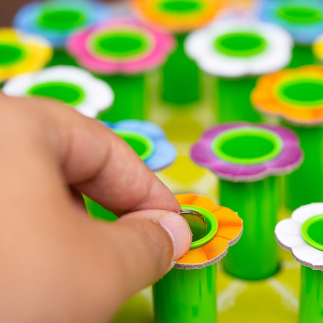 Durante la partida, los jugadores se irán turnando para mover la abeja según marque una tirada de dados. La abeja irá depositando fichas de polen en las flores de la fila en la que se detenga… ¡Y cada vez que lo haga podrás escuchar en qué flores deja caer el polen y en cuáles hay una mayor cantidad!