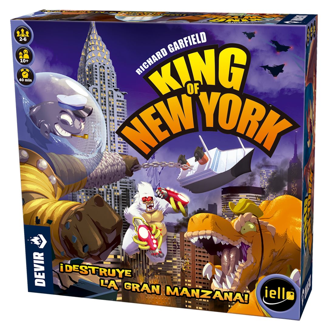 Richard Garfield es uno de los grandes diseñadores de juegos de mesa del siglo XX, creador de uno de los grandes juegos de cartas coleccionables, Magic: The Gathering, quien ahora nos trae King of New York, donde cada jugador será un monstruo gigante enfrentándose a otros monstruos para obtener el control total de Nueva York. El tablero de juego representa las diferentes islas de Nueva York: Manhattan, Bronx, Queens, Staten Island y Brooklyn. Tendrás que destruir todo lo que se interponga en tu camino, obtener nuevas habilidades para atacar a tus enemigos, destruir edificios y grandes rascacielos, ¡y no perder de vista a los militares! Podrás lograr todo esto gracias al sistema de tiradas de dados de King of New York, con el cual deberás hacer las mejores combinaciones de símbolos que puedas.