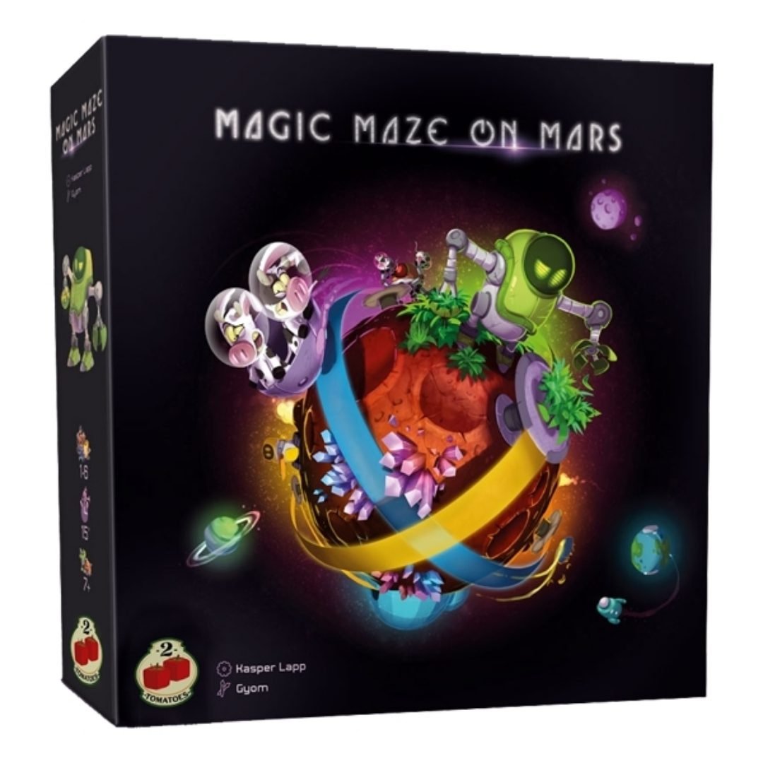 Magic Maze en Marte no es una expansión. Este juego ofrece una nueva experiencia basada en una aplicación diferente de los conceptos básicos de Magic Maze. Magic Maze en Marte es un juego cooperativo, mayormente silencioso, simultáneo, en tiempo real y ¡realmente original! Robots especializados están construyendo cúpulas habitacionales en la superficie de Marte, para albergar a los futuros colonos. Para ello, utilizan pistas magnéticas para propulsar vacas, plátanos y cristales a gran velocidad. Lo que hace que este juego sea único es que sólo el jugador al que se le permite mover recursos en la pistas verdes (por ejemplo) puede hacerlo. Por lo tanto, le toca a él saber cuándo es el momento adecuado para actuar, ya que los otros jugadores sólo pueden mirarlo fijamente y colocar el peon «¡haz algo!» delante de él, ¡con la esperanza de que reaccione! Los jugadores tendrán que coordinarse para mover los recursos, construir las cúpulas y poblarlas con los colonos.