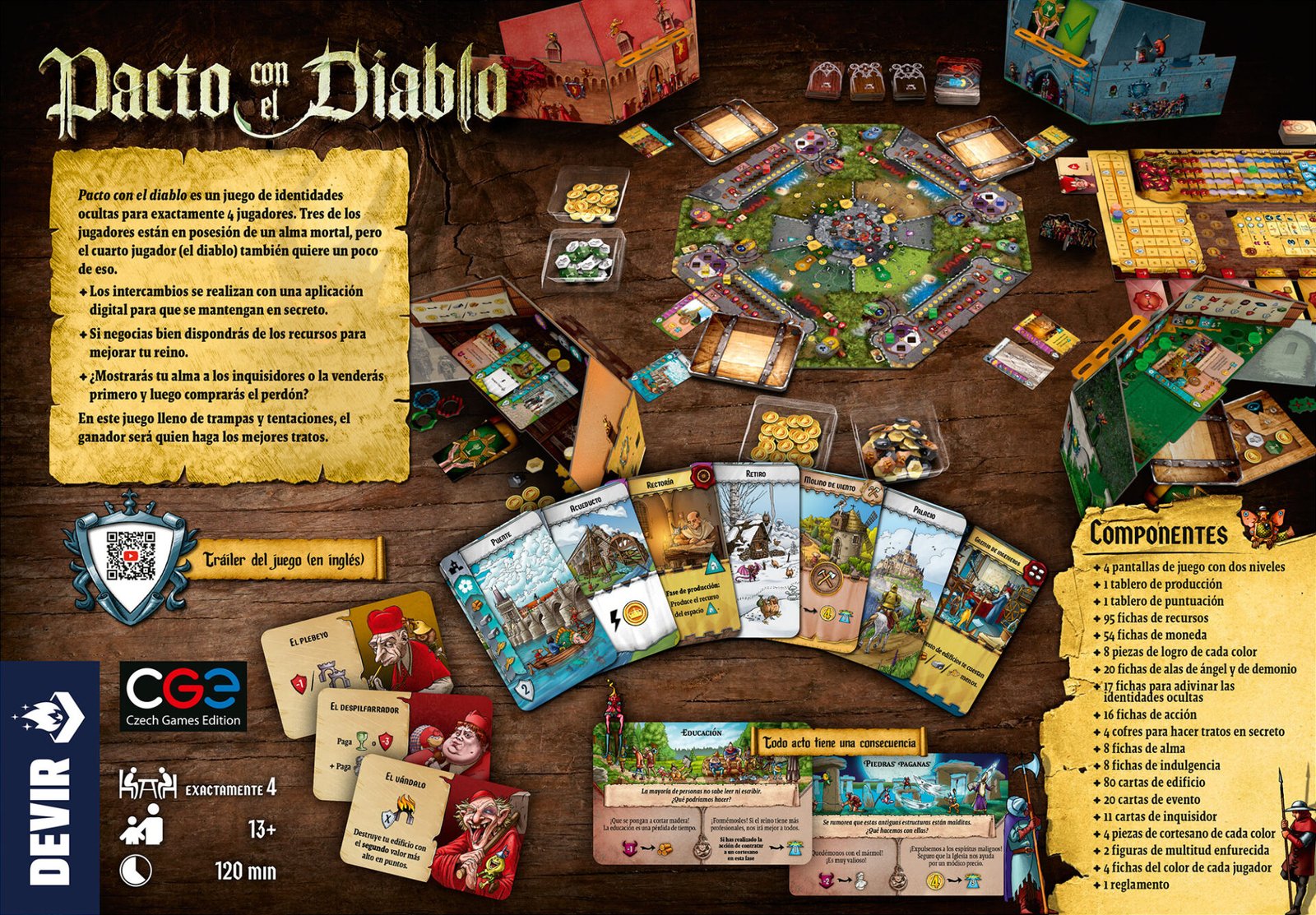 Obra de Matúš Kotry, autor del célebre Alquimistas, y con arte de David Cochard, Pacto con el diablo es un juego pensado para un grupo de exactamente 4 jugadores, a partir de 14 años, que ofrece partidas de unos 120 minutos. Con mecánicas de roles ocultos, gestión de recursos, deducción y construcción de motores, Pacto con el diablo reta a los jugadores a negociar sabiamente para lograr la mayor cantidad posible de puntos.