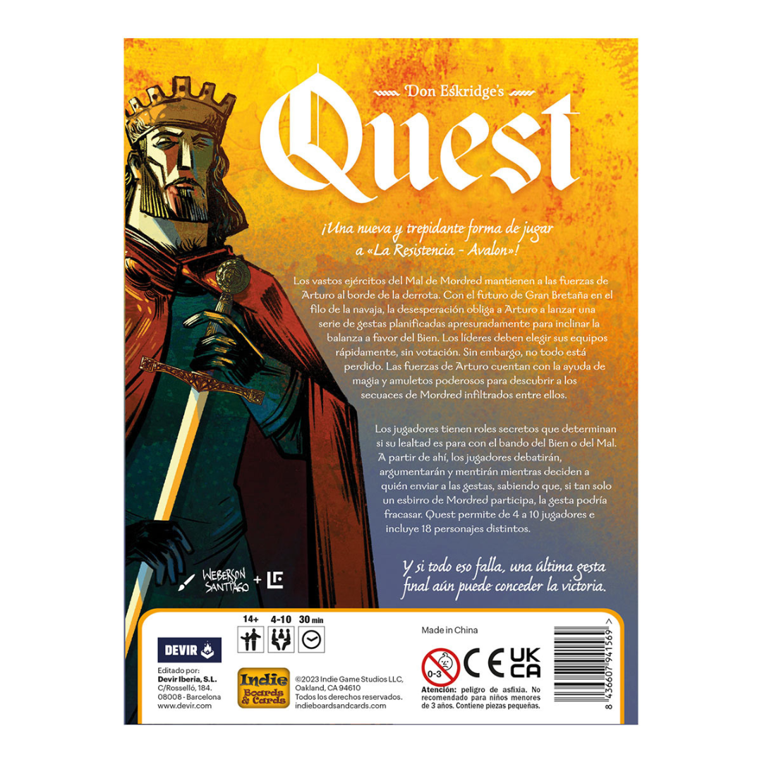 Con 25 personajes distintos a disposición de los jugadores, nunca dos partidas serán iguales. Tras la estela de los clásicos La Resistencia y La Resistencia: Avalon, Quest da una nueva vuelta de tuerca al género de juegos de roles ocultos que no defraudará a los jugadores más experimentados. ¡Decide el destino de Gran Bretaña poniendo a prueba tu labia y dotes de deducción!