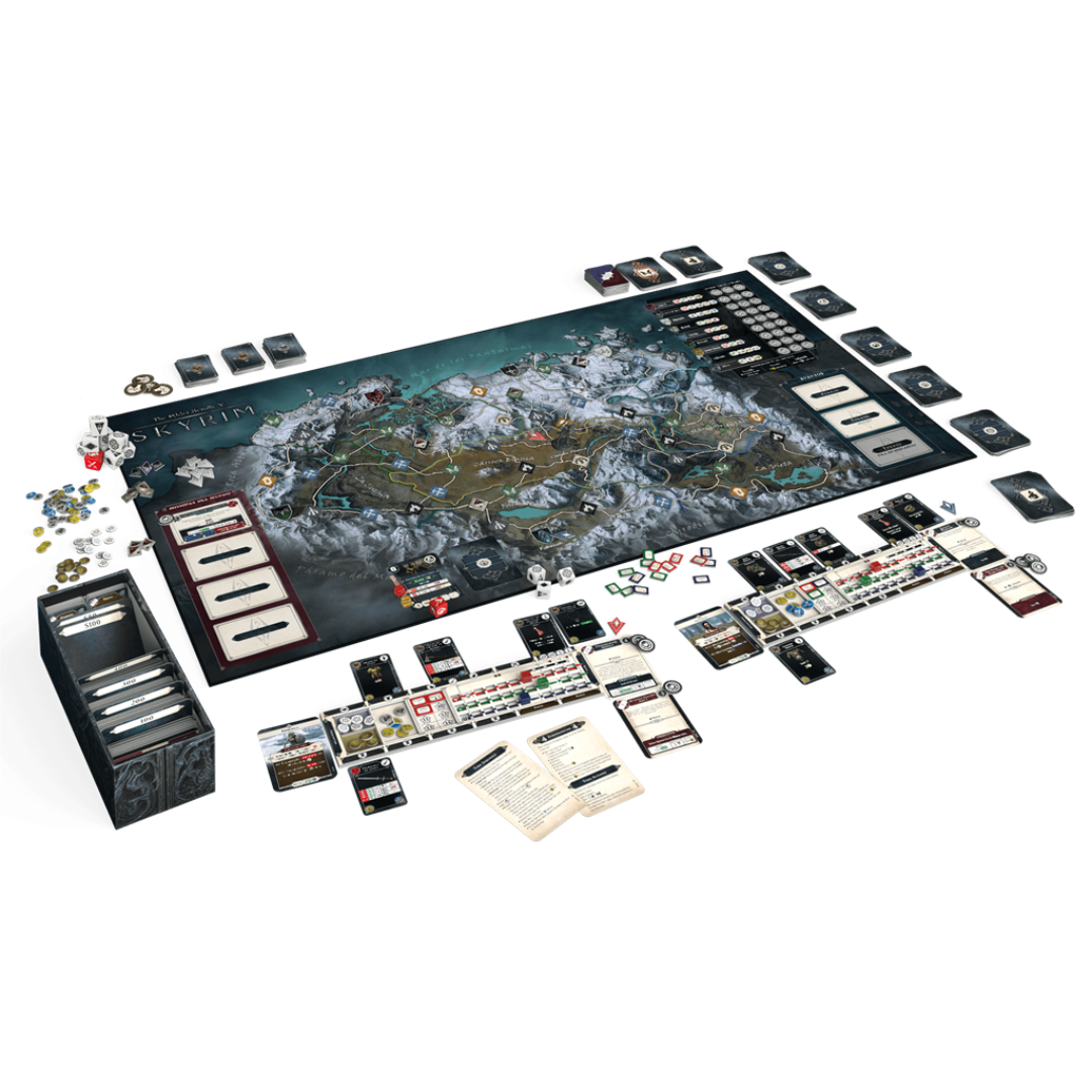 El tablero de juego representa la provincia de Skyrim. Los jugadores mueven a sus personajes por la región, visitando capitales, explorando mazmorras y conociendo a personajes interesantes a medida que se desarrolla la historia. Pero no estarán solos; también aparecerán monstruos errantes que bloquean los caminos y amenazan la paz en Skyrim. Varios efectos del juego podrÃan provocar la caÃda de una capital, por lo que los jugadores deben vigilar el estado de cada una de ellas y los peligros activos en todo el tablero.