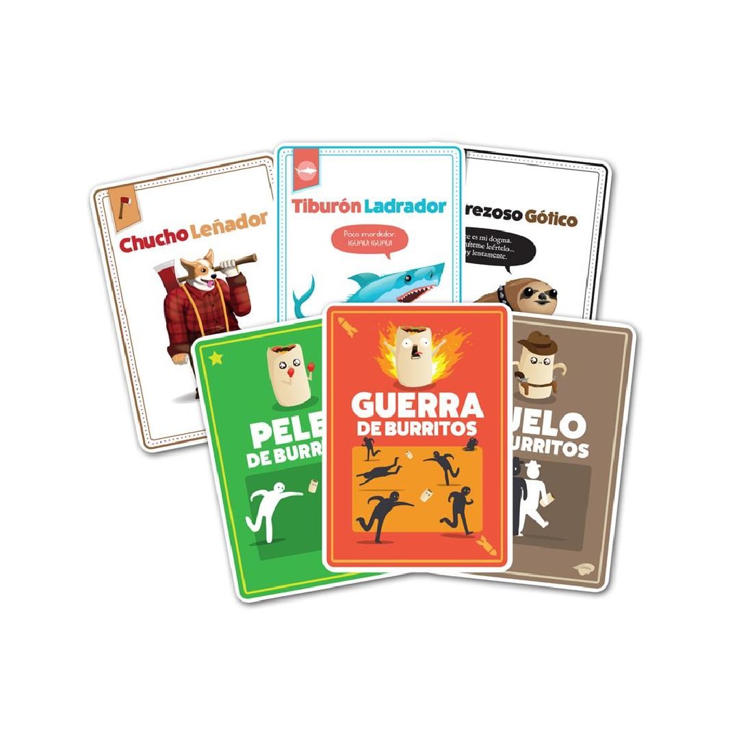 Empiezas con una mano de cinco cartas y tendrás que descartarte de ellas rápidamente hasta conseguir un trío que puede ser de animales locuelos o de pelea con burritos. Si es uno de estos últimos, prepárate, porque aquí llega la parte más adrenalínica y divertida del juego, especialmente cuando sale un trío de Guerra de Burritos y la mesa se convierte en un todos contra todos con burritos volando por todas partes.
