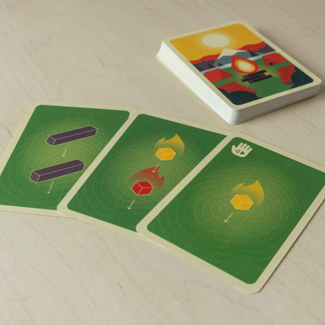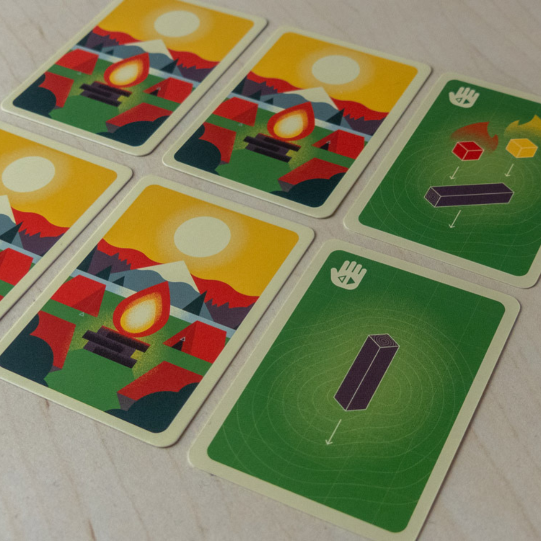 Usa las pinzas para construir el fuego de campamento con los troncos y los cubos de fuego. Si alguna pieza se cae de la torre, ¡quedas eliminado! Revela una nueva carta y construye el fuego. Al final de tu turno, pásale las pinzas al siguiente jugador. El último jugador que quede, al ser eliminados todos los demás, será el ganador y es nombrado «Mejor campista».