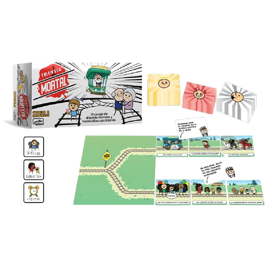 Con una premisa tan sencilla y tan sólo con un mazo de 500 cartas ilustradas con el inconfundible estilo de sus creadores, Cyanide and Happiness, Tranvía Mortal es un juego en el que ganar es divertido, pero no tanto como los argumentos delirantes que emplearás para conseguirlo.