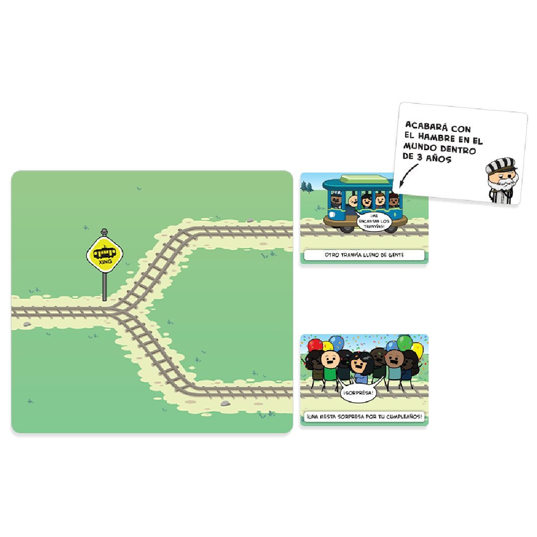 Y es que el juego hace gala del mismo humor negro que el webcomic, solo que multiplicado por mil millones: Las vías entre las que tendrás que elegir acabarán plagadas de inocentes víctimas, pero también de terribles malhechores y de complicaciones morales extra que pueden dar la vuelta a la partida en un santiamén: Todos tenemos bastante claro que jamás pasaríamos con nuestro tranvía por una vía donde hay una piscina de agua con un grupo de niños jugando… ¿Pero y si un poco más adelante hubiera un enjambre de mosquitos mutantes que acabará eliminando a media Humanidad? ¿Y SI ADEMÁS UNO DE ESOS MOSQUITOS ES LA CLAVE PARA ACABAR CON EL HAMBRE EN EL MUNDO?
